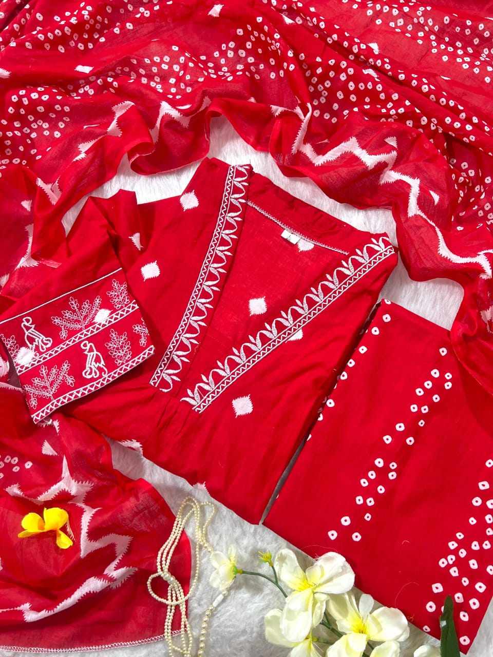 Cotton Kurti with white thread embroidery work on neck and matching Pant and malmal cotton