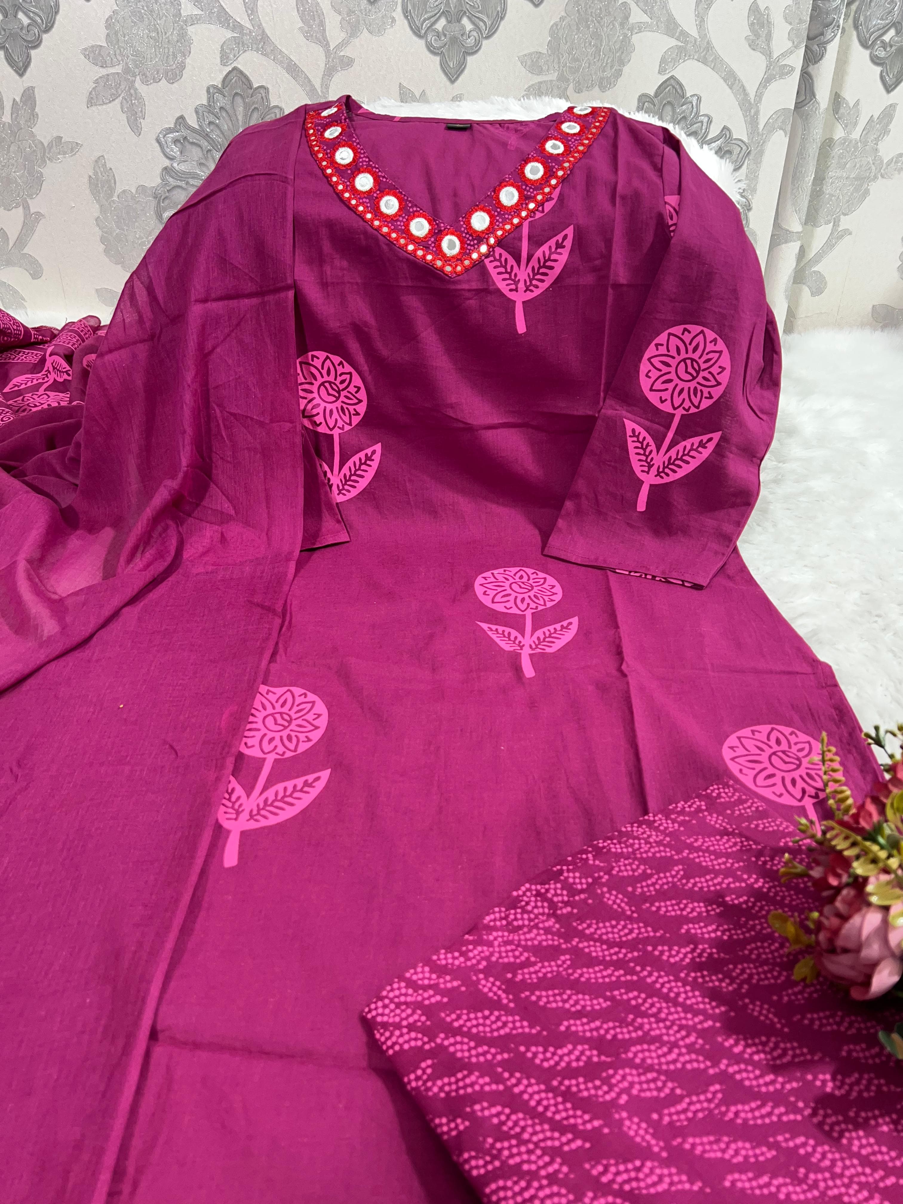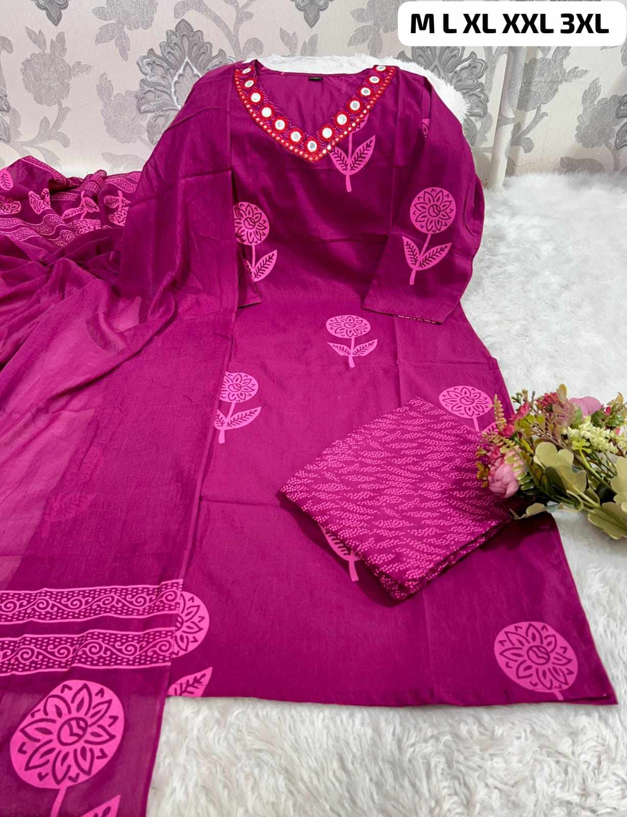 JKWH 998 Pure Fine Cotton Febric Embroidery Work A-line Kurti Set With Pocket